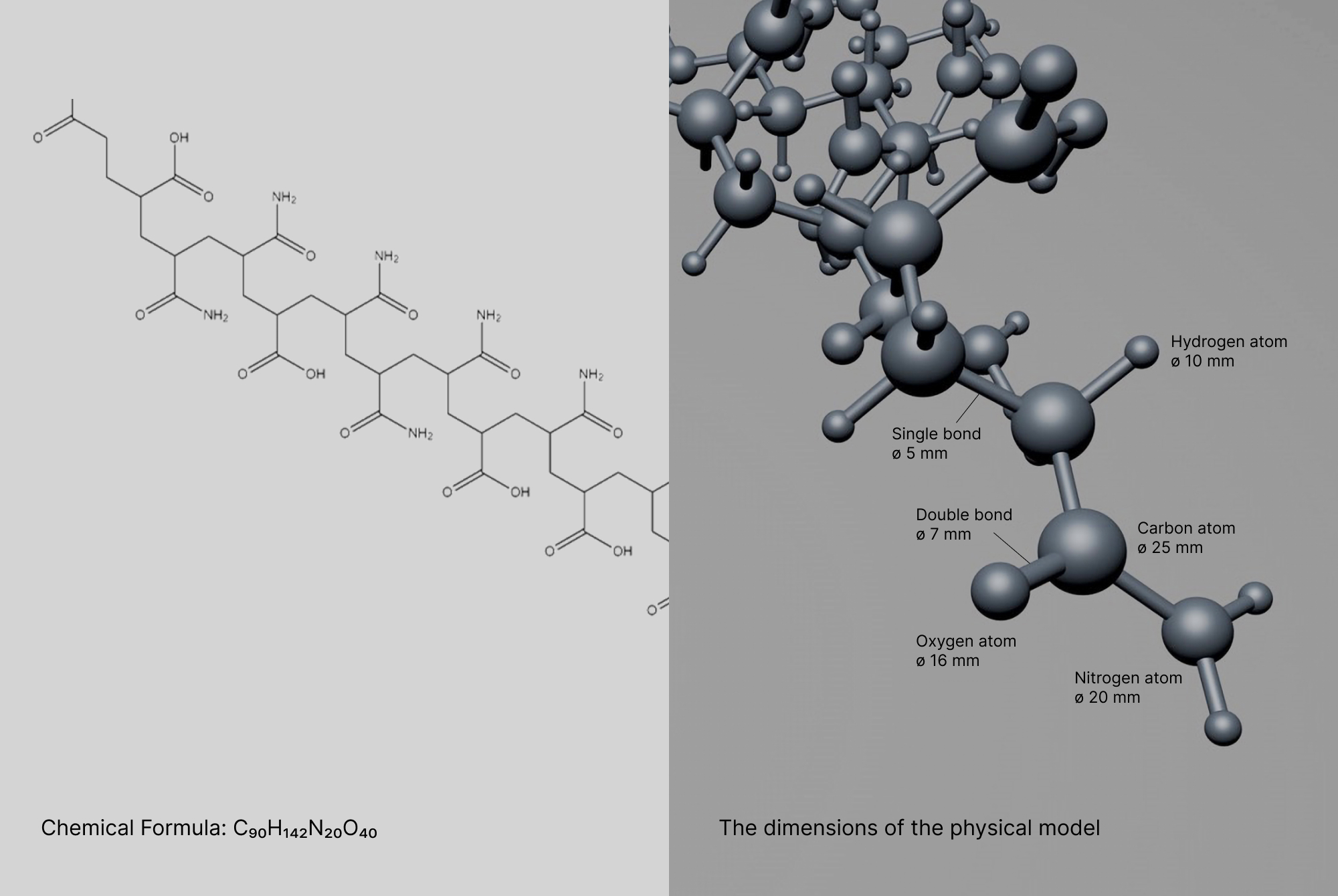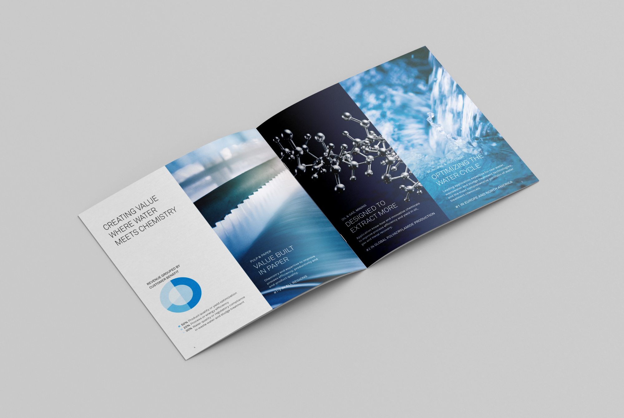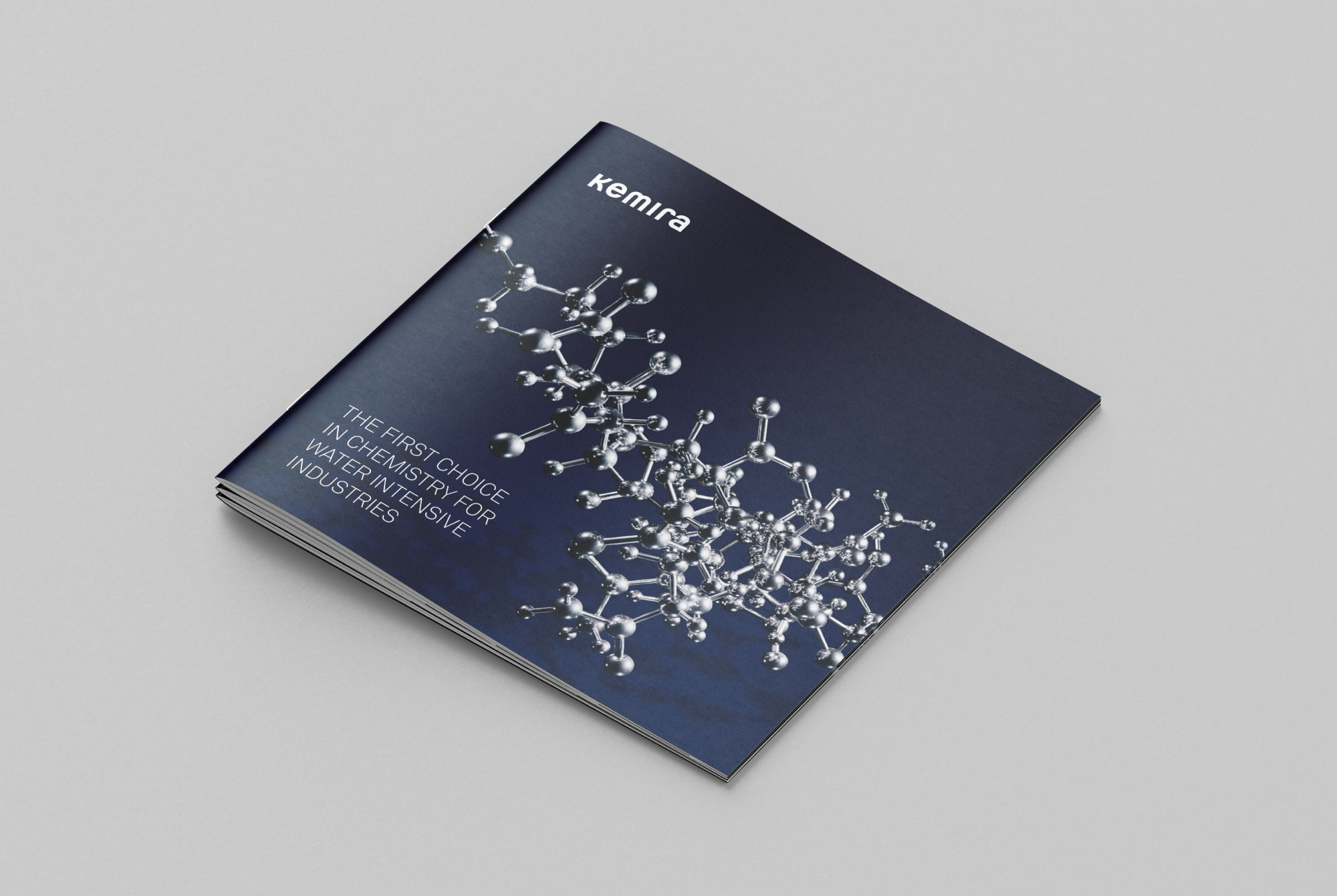 Kemira’s corporate brochure highlighted their latest polymer innovation, which enhances resource efficiency in oil, gas, and metal recovery. For the main image, the polymer’s chemical formula was constructed into a physical model made of metal and photographed in a studio. Upon the release of the materials, the physical polymer model was displayed at Kemira’s headquarters.